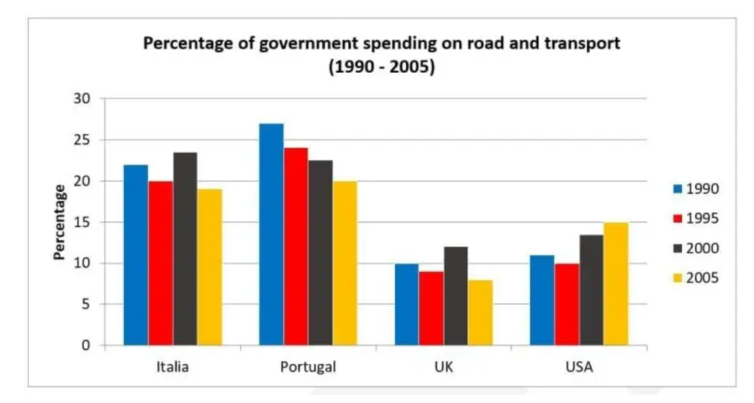 The provided bar chart illustrates the differences in transport expenditures for 4 different areas from 1990 to 2005. Overall, it can be seen that Portugal and Italy were the bigger spenders when it came to road and transport over the 25-year period.